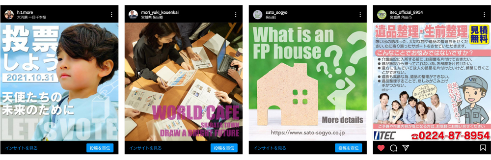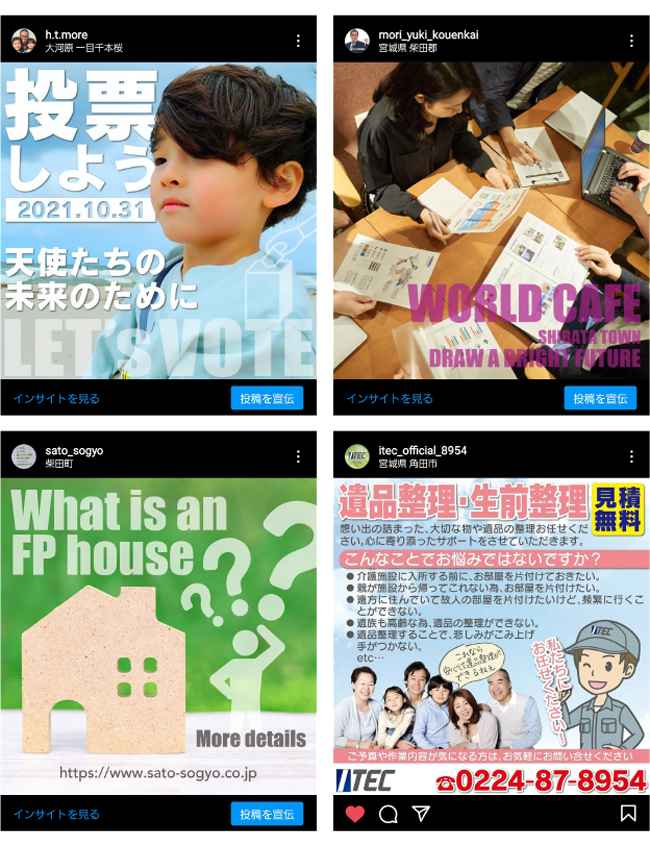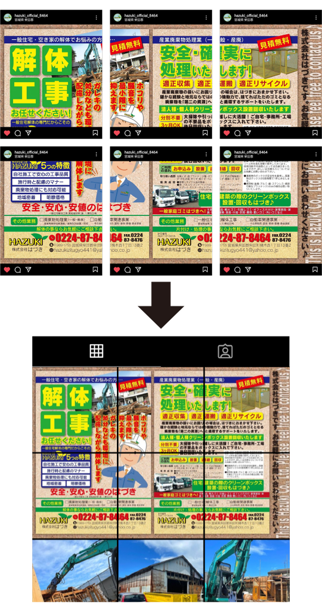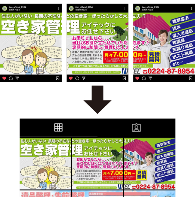 プロフィールページを開いた時の見た目の統一性を重視した投稿がしやすくなります。単に画像を投稿してくのではなく、ロゴを入れたり問い合わせ先を入れたり、関心を惹く文言を入れたりと工夫することで興味を抱いてもらえ、効果が上がります。加えて、プロフィールへ誘導するための加工や投稿数を考え、先をイメージした宣伝を行うことも効果を上げる手法の一つです。そういった内容を合わせをさせていただき、最良の状態で掲載しPRへの効果を上げる素材を作成いたします。
