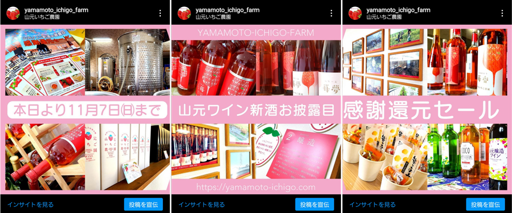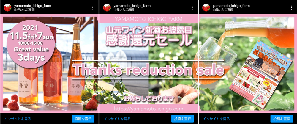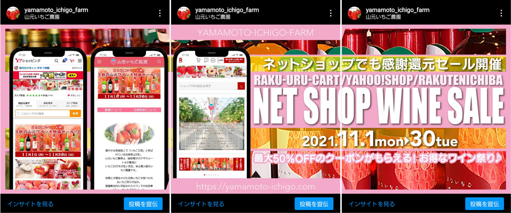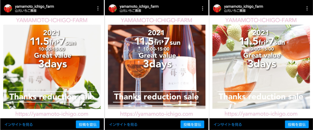 セール案内画像作成+ホームページへ誘導する文章の作成。3連画像(連続投稿)でインパクトのあるワンデザイン仕様。