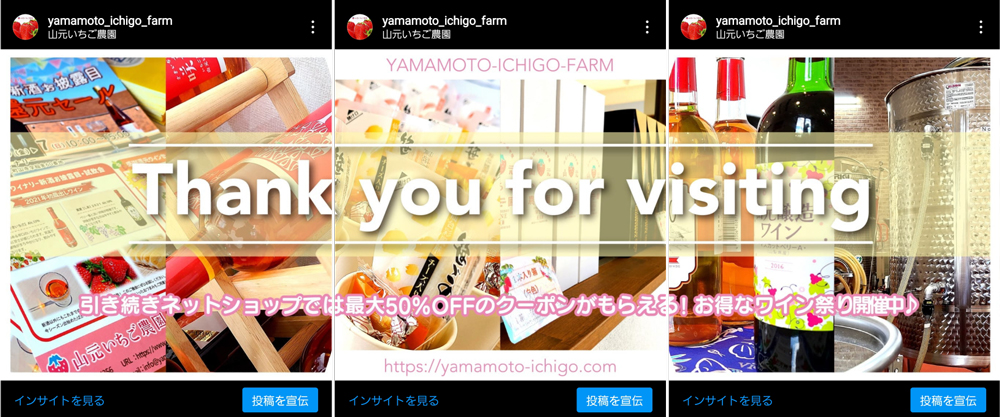 イベント終了後、御礼のメッセージを投稿。3連画像(連続投稿)でインパクトのあるワンデザイン仕様。